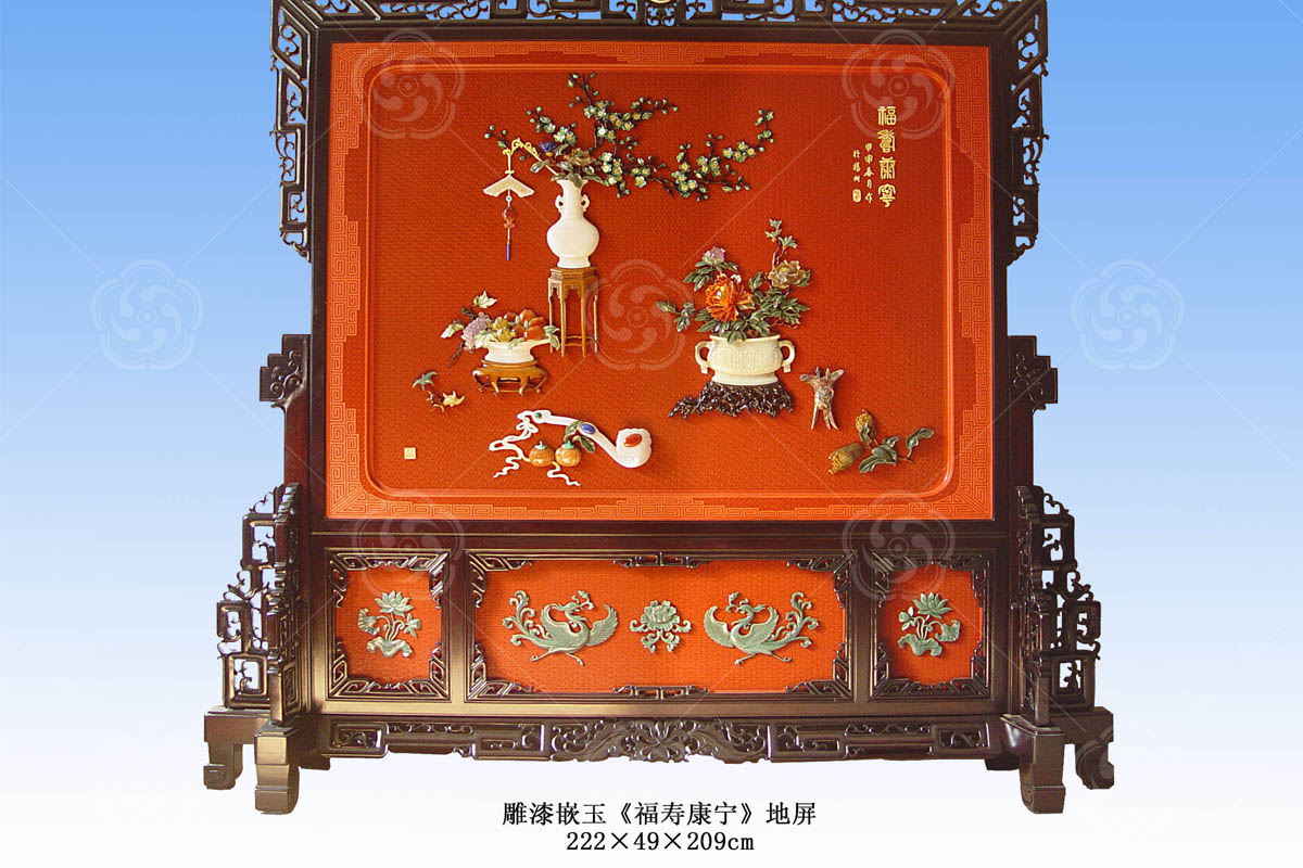 該精品選用了翡翠、白玉、瑪瑙、碧玉、青金、孔雀石、虎金石、象牙等高檔材料,雕琢了西周的簋,春秋的壺瓶,殷商的爵杯,吉祥如意和豐滿的果盤等主要圖案,在這些器皿上插裝了牡丹、梅花、茶花、蜜桃、石榴、佛手和掉罄等二十多種艷花鮮果,簋、瓶器皿表面雕刻了面的夔紋、唐草紋薄浮雕圖案精美細(xì)致,下窗雙鳳牡丹紋樣對稱,應(yīng)用傳統(tǒng)的一部書雕漆錦紋襯托了整體畫面,精湛雅美的整幅圖案,愚意著吉祥富貴、福壽三多、四四如意,以佛手、桃、牡丹、瓶、菱體現(xiàn)了福壽康寧。